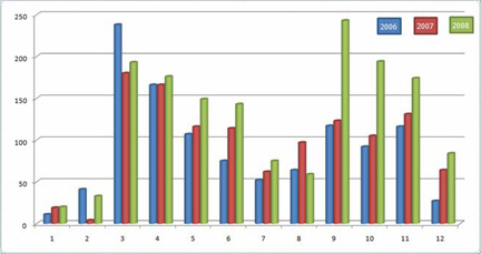 3. 展覽數(shù)量在趨于平均,比如春季的3個月和秋季的3個月,而比較一下三年前的展會(見下一張圖),近兩年來,這個現(xiàn)象是不明顯的,而以前,3月和9月有明顯的數(shù)量優(yōu)勢。